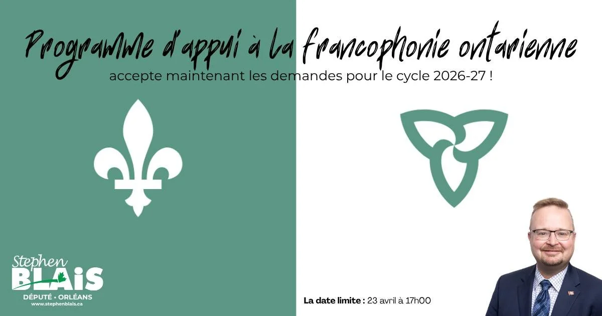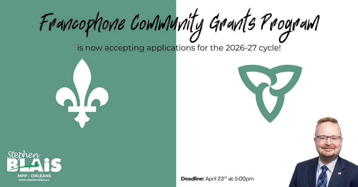 The Francophone Community Grants Program is now accepting applications for 2026–27, supporting initiatives that strengthen French-language services and drive economic development across Ontario.